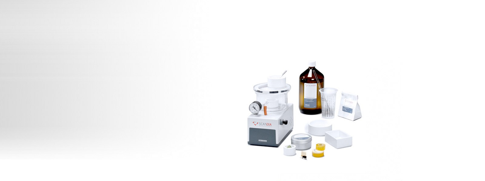- A variety of useful and practical mounting accessories: EMBEDDING SET, SCANDICLIP plastic clips, VACUUM SET UNIVERSAL, a vacuum mounting and impregnating device, AEQUIDUR hardness regulator, etc.